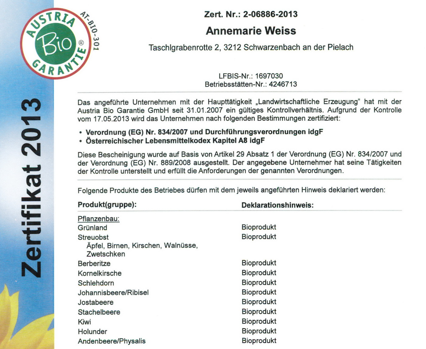 | aktuell | 06:01, 22. Mär. 2014 | 1.400 × 1.148 (377 KB) | Weiss (Diskussion | Beiträge) | (Biozertifikat 2013 / 2014 Bildquelle: Zertifikat - Steinschaler Naturhotels Bild darf nur nach Rückfrage und mit klaren und unmißverständlichen Hinweis und Link auf den Urheber und dessen Organisation und nicht kommerziell verwendet werden. [[K) | |